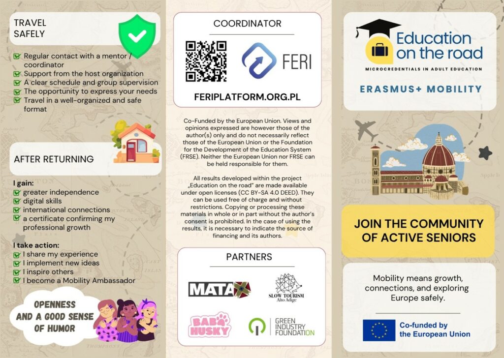 As the first brochure prepared within the project, this publication is also an important dissemination tool. It helps explain the idea of Education on the Road in a simple and engaging way and translates the project’s objectives into an understandable message for participants, educators, and organisations working in adult education. It is designed not only to inform, but also to motivate and support a more conscious approach to educational mobility.